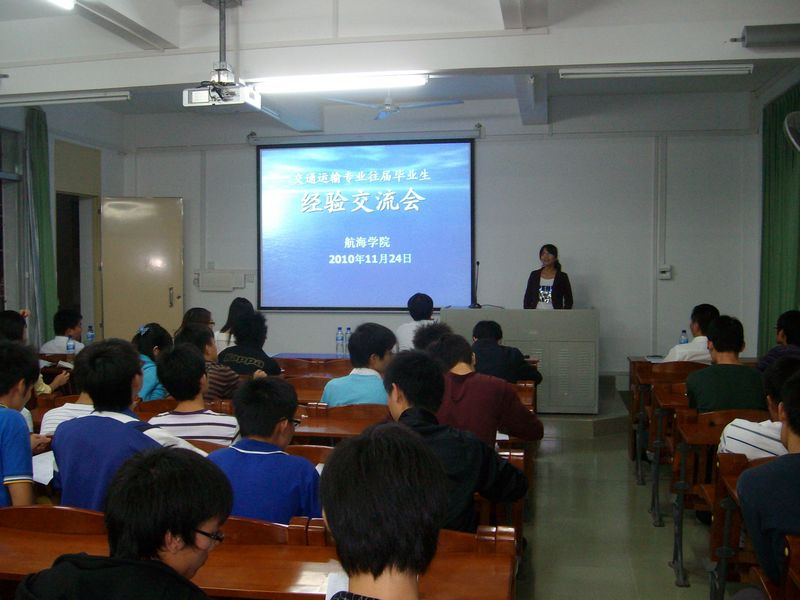 11月24号晚上,航海公司交通运输专业往届毕业生回校给08级交通运输专业同学作经验交流会。交流会在霞山校区教学楼302课室举行,其时交通运输08级同学正在湛江港集团进行为期两个星期的实习。航海公司航海系主任范少勇副教授、辅导员李明焜老师也应邀出席。