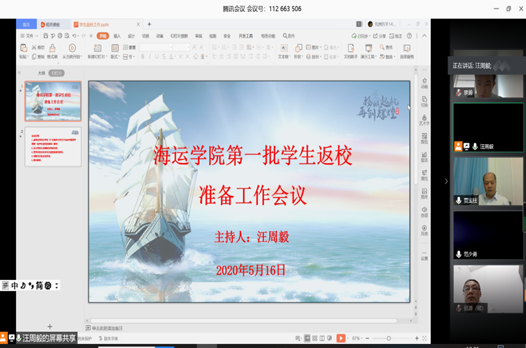 廖勇老师向全体员工传达《伟德victor1946网站关于2020年春季学期第一批员工返校的通知》,针对员工返校前、返校中、返校后,结合海运公司防疫领导工作小组工作部署,与大家解读了具体实施方案。