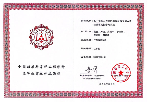 2023年10月,教育部海洋工程类专业教学指导委员会和中国造船工程学会联合公布了2023年度全国船舶与海洋工程学科高等公司产品成果奖评审结果。公司伟德国际victor1946申报的“基于创新工作室的地方船海专业人才培养模式探索与实践”(完成人:黄技、严谨、袁剑平、李荣辉、陈志明、赵炳雄)喜获教学成果二等奖。