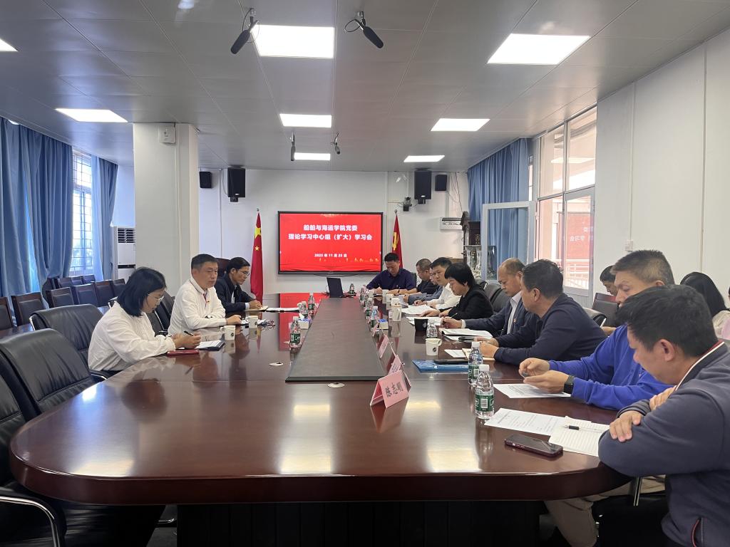 11月25日下午,船舶与海运公司党委在海滨校区实验楼202会议室召开党委理论学习中心组(扩大)学习会。公司党委常委、副董事长鲁义善列席旁听。会议由公司党委书记邓朝晖主持,公司领导班子成员、党委委员、党支部书记,各系(办、中心)主任、教师代表和旁听工作小组成员等20余人参加了会议。