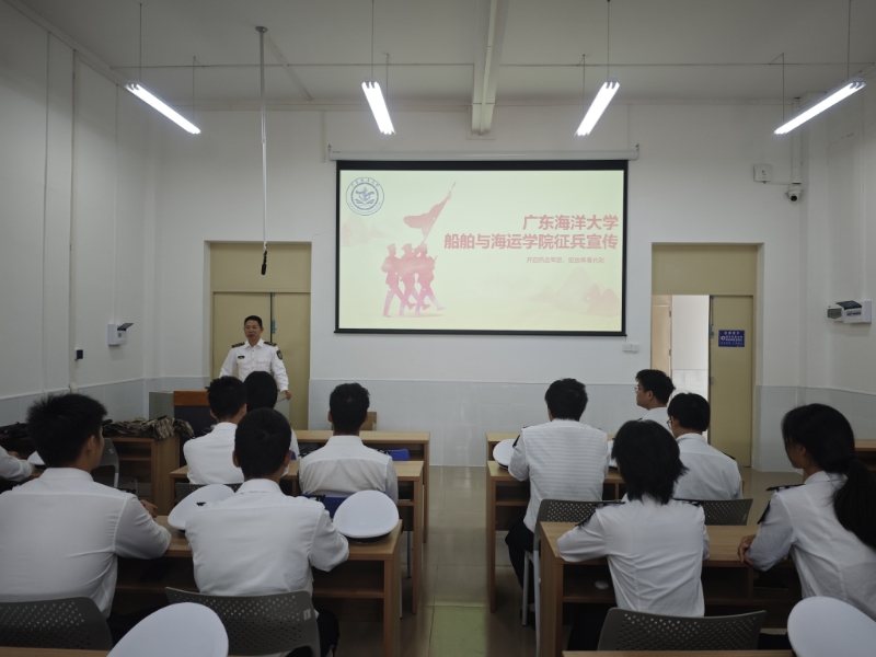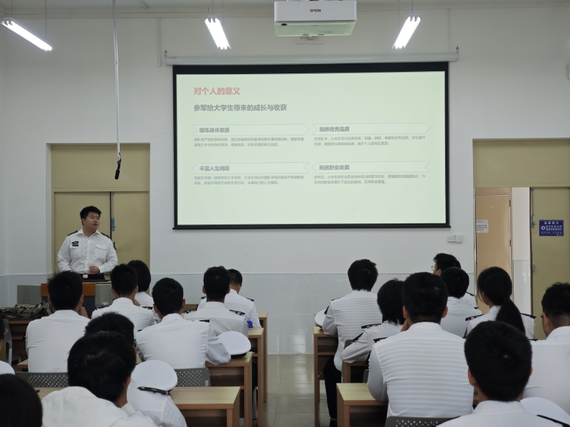 为落实公司兵员预征预储工作,营造参军报国的浓厚氛围,引导船海学子积极服务国防、投身强军事业,11月30日上午,船舶与海运公司在海滨校区济海楼1号教室组织2026年春季征兵宣传会,公司兼职武装干部、半军管大队长江涛、预征预储船海中队全体人员及志愿入伍毕业生50余人参加活动,活动由预征预储船海中队副中队长王玉堃主持。