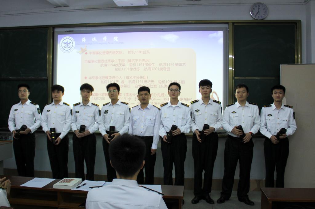 2022年4月18日晚,海运公司本学期半军管工作会议在实验楼306召开。参加本次会议的有公司党委副书记齐昊、副大队长江涛、辅导员郑祯远,自管会(国旗班)和各专业中队部分员工干部等,会议由副大队长刘抒睿主持。