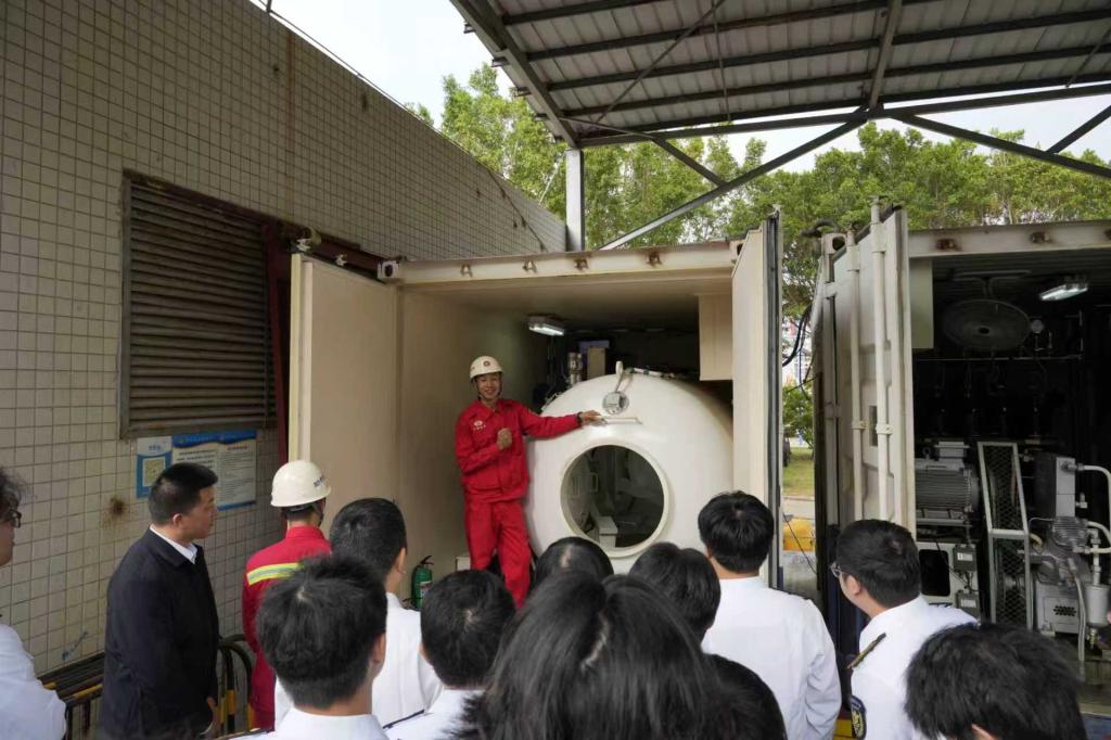 首先,牛念喜等带领师生走进救助设备室与减压舱,细致讲解各类设备的功能原理、操作流程及实战应用场景。从应急救援装备的精准调试,到减压舱保障潜水员安全的核心机制,员工的生动讲解与实物观摩相结合,让同学们跳出课本理论,直观感受海上救助工作的专业性与严谨性。