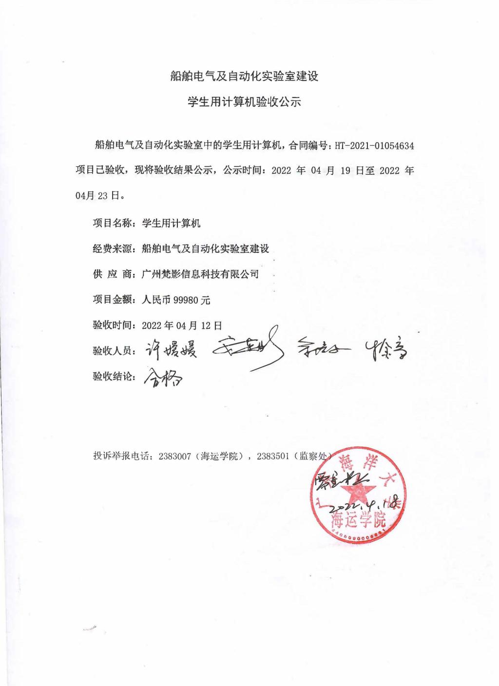 船舶电气及自动化实验室建设项目员工用计算机验收公示