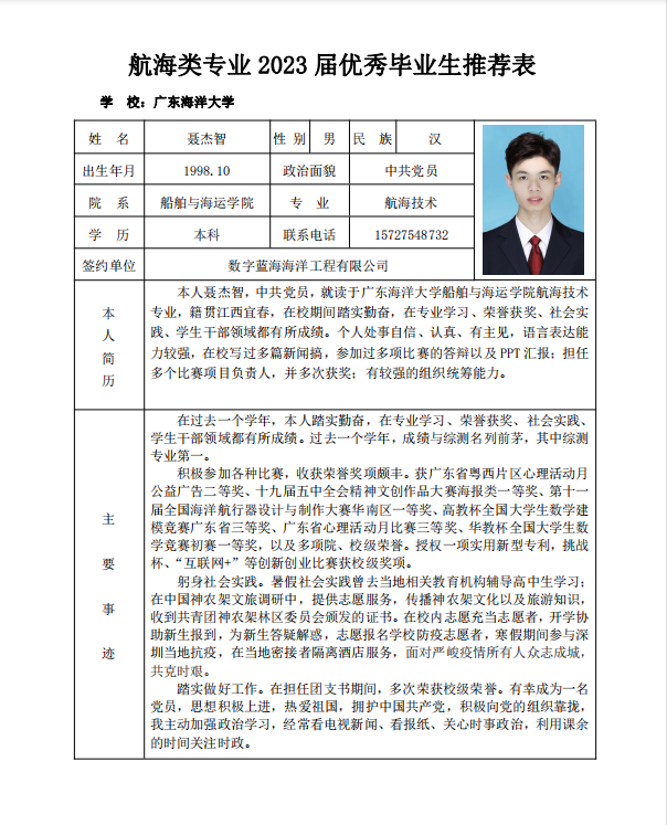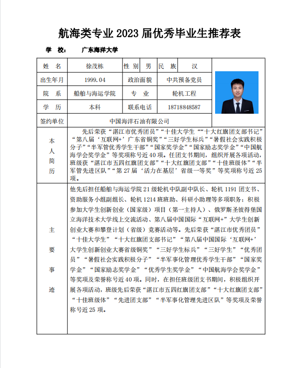 根据《关于开展航海类专业 2023 届优秀毕业生评选工作的通知》要求,伟德国际victor1946通过组织航海类专业毕业生个人申报、材料审查和会议讨论推荐,最终确定推荐航海1191班聂杰智和轮机1191班徐茂栋两名同学,现予以公示。