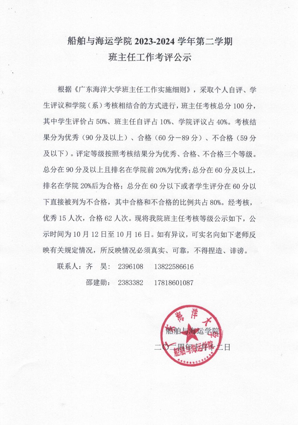 根据《伟德victor1946网站班主任工作实施细则》,采取个人自评、员工评议和公司(系)考核相结合的方式进行,班主任考核总分100分,其中员工评价占50%、班主任自评占10%、公司评议占40%。考核结果分为优秀(90分及以上)、合格(60分-89分)、不合格(59分及以下)。评定等级按照考核结果分为优秀、合格、不合格三个等级。总分在90分及以上且排名在公司前20%为优秀;总分在60分及以上,排名在公司20%后为合格;总分在60分以下或者员工评分在60分以下直接被列为不合格,其中合格和不合格的比例共占80%。经考核,优秀15人次,合格62人次。现将公司班主任考核等级公示如下,公示时间为10月12日至10月16日。如有异议,可实名向如下老师反映有关规定情况,所反映情况必须真实、可靠,不得捏造、诽谤。