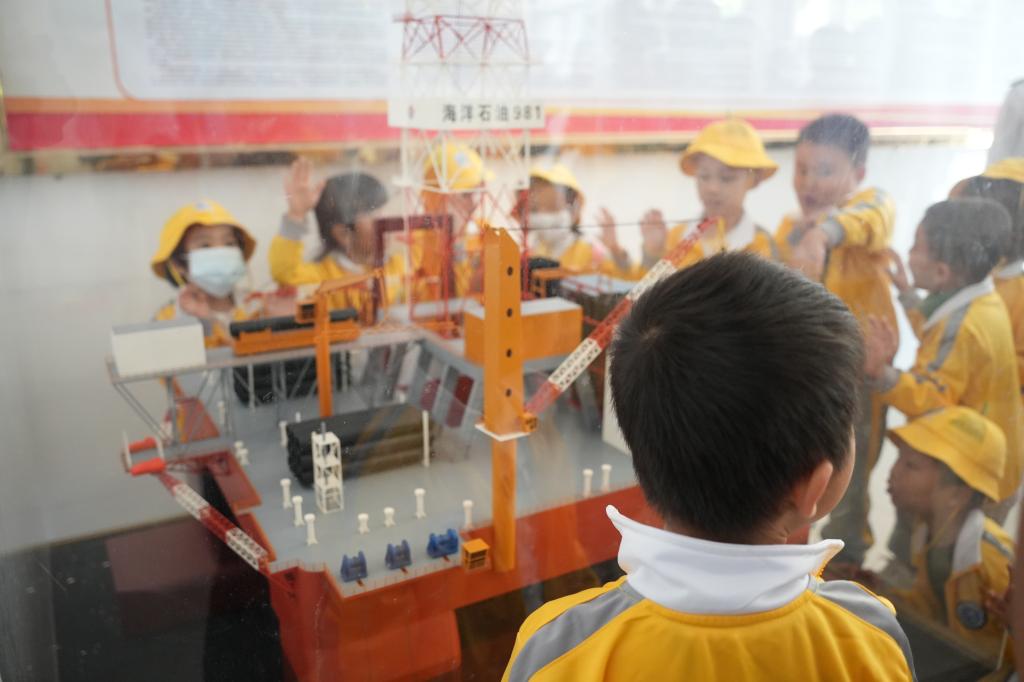 在海洋石油981深水半潜式钻井平台前,孩子们的目光被这座中国首座自主设计、建造的钻井平台所吸引。志愿者们生动地讲解了这座工业奇迹背后的故事,展示了中国海洋科技的飞速发展和科技进步的辉煌成就。孩子们听着这些激动人心的故事,眼中闪烁着对祖国的自豪和对未来的憧憬。