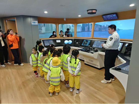 随后,最让小朋友们兴奋不已的航海模拟器体验环节到来了。走进模拟器所在的空间,那逼真的驾驶台场景瞬间吸引了孩子们的目光。志愿者们逐一介绍驾驶台上各种仪器的操作方法以及它们各自的重要作用。在志愿者的指导下,小朋友们一个个迫不及待地来到驾驶位,体验起航海驾驶的快乐,兴奋和求知的欲望洋溢在每一个孩子的脸上,整个现场充满了童真与探索的热情。